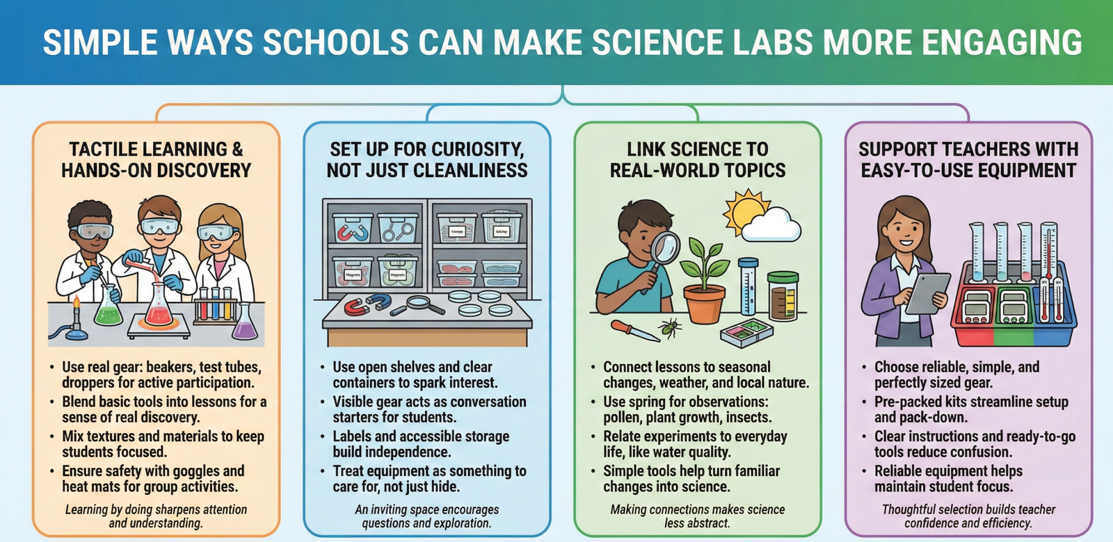 Science labs make a bigger impact when the space is clear, flexible, and stocked with tools that encourage questions. Simple setups, labelled benches, and a mix of equipment choices help every student find their way into hands-on science.
