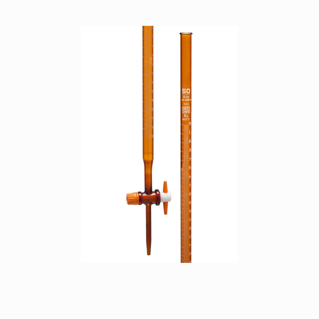 Amber Burette with PTFE Stopcock, Class B Accuracy, BORO 3.3 is designed for dependable titration and routine volumetric dispensing where light protection, smooth flow control, and chemical resistance are important. The amber borosilicate body reduces UV and visible light transmission, helping protect light sensitive titrants and analytical reagents from photodegradation. This supports better concentration stability and more consistent endpoints during day to day titration work in teaching, research, and quality control laboratories.